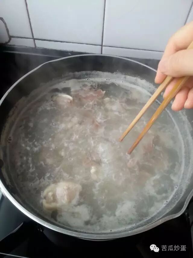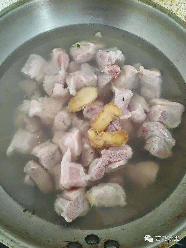 在冷水里加葱段和姜,烧开后加入咸肉和排骨,大火烧开后撇去浮沫,煮二十分钟到半个小时