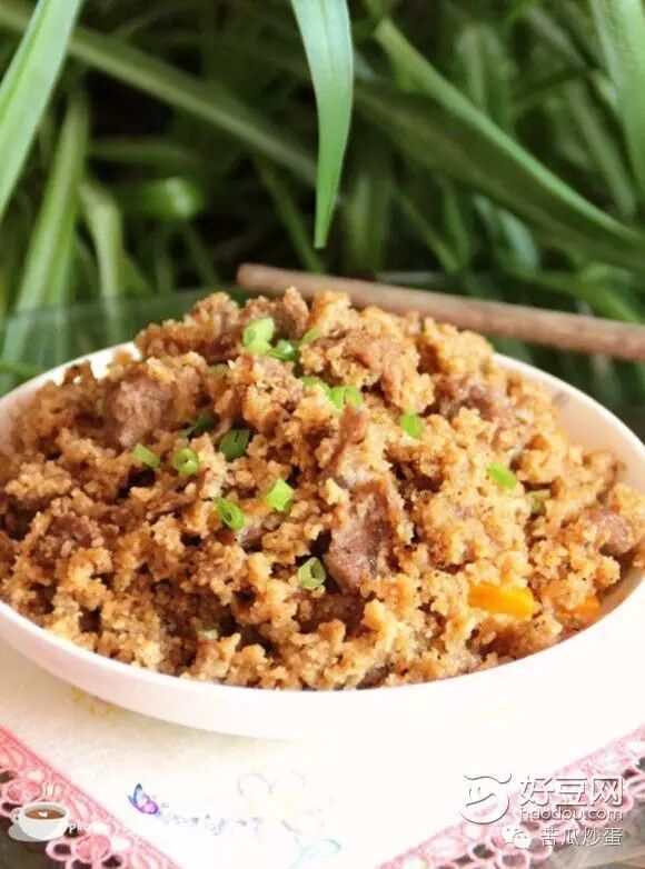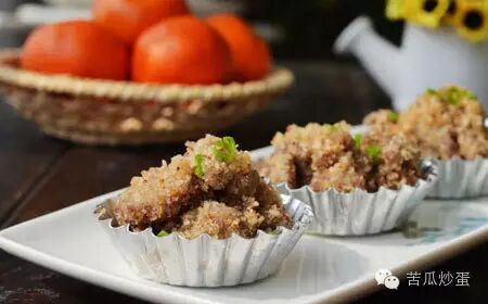 把拌好的梅菜饭均匀盖在肉卷上,放到锅里蒸大概30分钟到肉烂,取出来,把碗里的饭倒扣在盘子里,那些裹着莲子的肉就露在上面了。