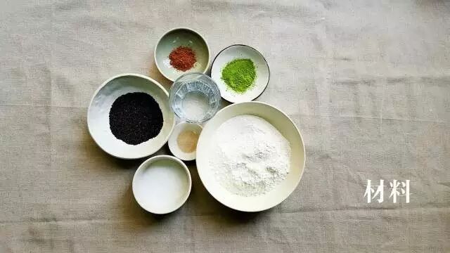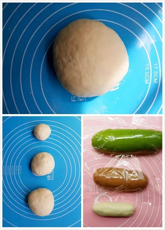 取出1中的面团,排气后将其分割成三份,分别用来做抹茶面团、可可粉面团、白面团。(抹茶面团需100g,可可面团需70g,白面团30g),接着分别加入可可粉和抹茶粉继续揉至混合。
