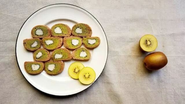 将白面团搓成细长条——猕猴桃的白心,抹茶面团擀成长面片——猕猴桃果肉,可可粉面团擀成长面片——猕猴桃果皮。