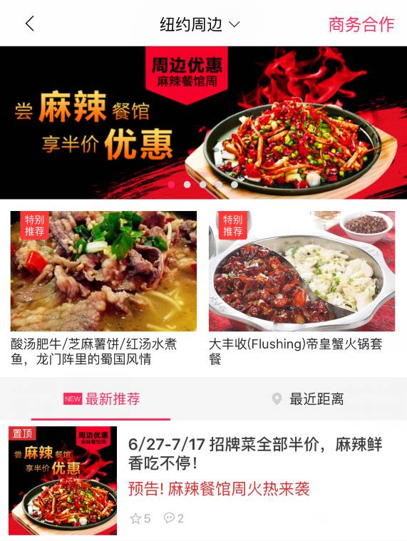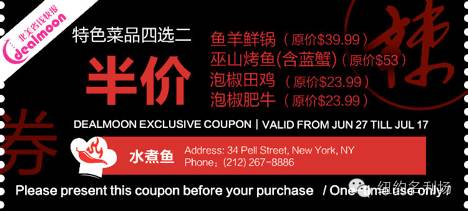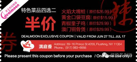 尝麻辣餐馆,享火爆优惠!由DealMoon主办的首届纽约麻辣餐馆周活动于6月27日-7月17日与你火辣邂逅!川菜湘菜贵州菜新派麻辣菜样样俱全,烤串火锅海鲜干锅道道精致,让你吃遍扭腰的麻辣餐馆,凡下载Dealmoon APP,点击"周边优惠"出示折扣信息,即可获得半价优惠!快和你的小伙伴们约起来!