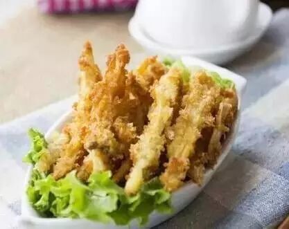 4.锅里倒油烧至6成热,将裹面包糠的杏鲍菇放入,炸至两面金黄捞出即可。