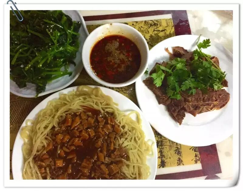 黄面是小麦粉里添加了一种沙漠植物蓬灰做的,吃起来有股碱面味。也可能是时间太晚了,面似乎煮得过软了一点。上面的浇头有豆腐干,似乎还有香菇丁,一大股子酱油汤、淀粉糊和豆腐卤水的味道,说不上是好吃还是不好吃。当妈的在北方呆过,默默地夹了几筷子,边吃边陷入回忆。女儿显然不爱吃,挑了几根,直奔驴肉去了。