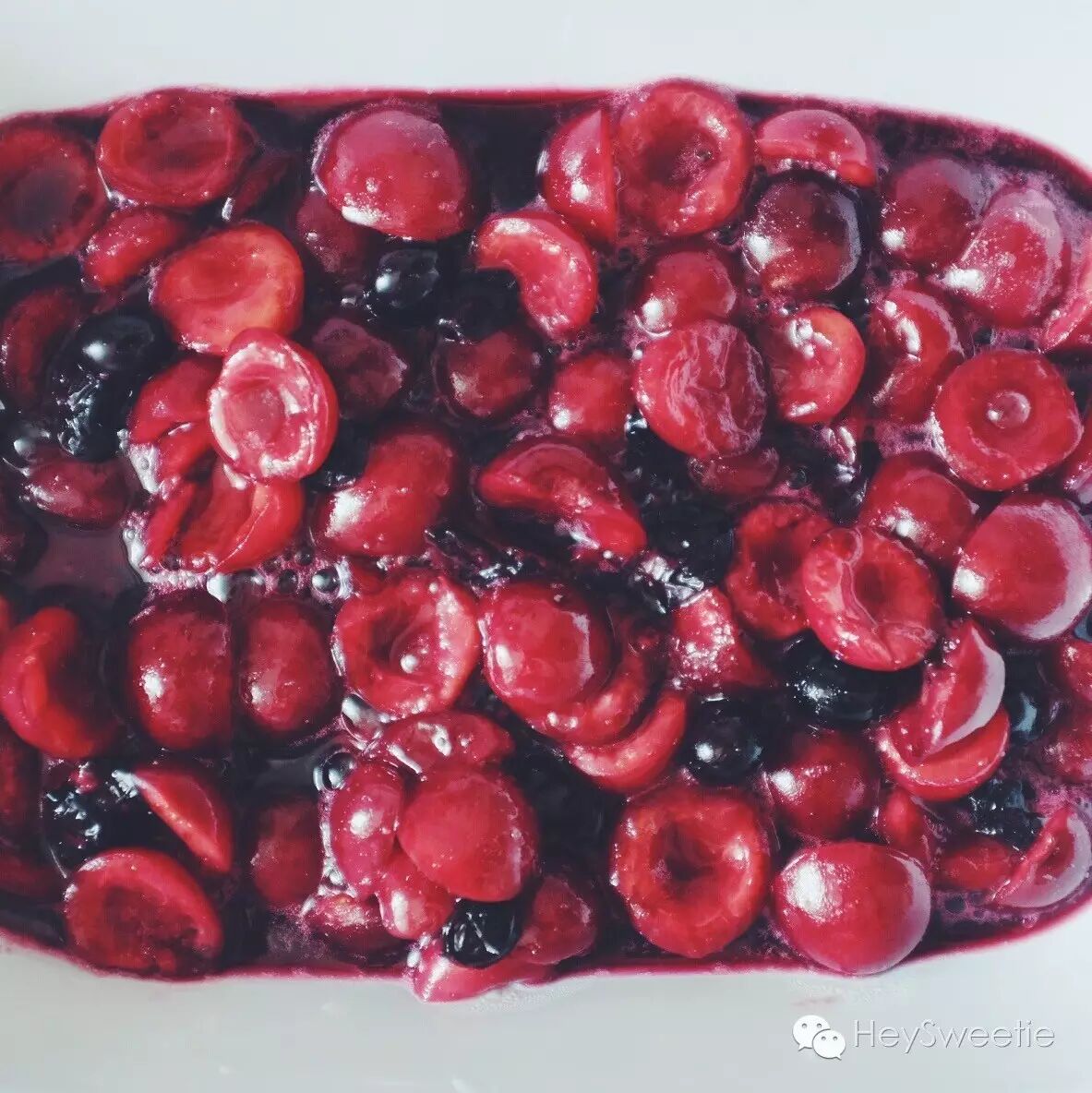 樱桃跟蓝莓,也可以是草莓+蓝莓,树莓+蓝莓,苹果+黑莓,李子,杏,黄桃……水果的味道比较浓郁,汁水比较多的,烤过之后味道都不错。樱桃对半切开,去核。