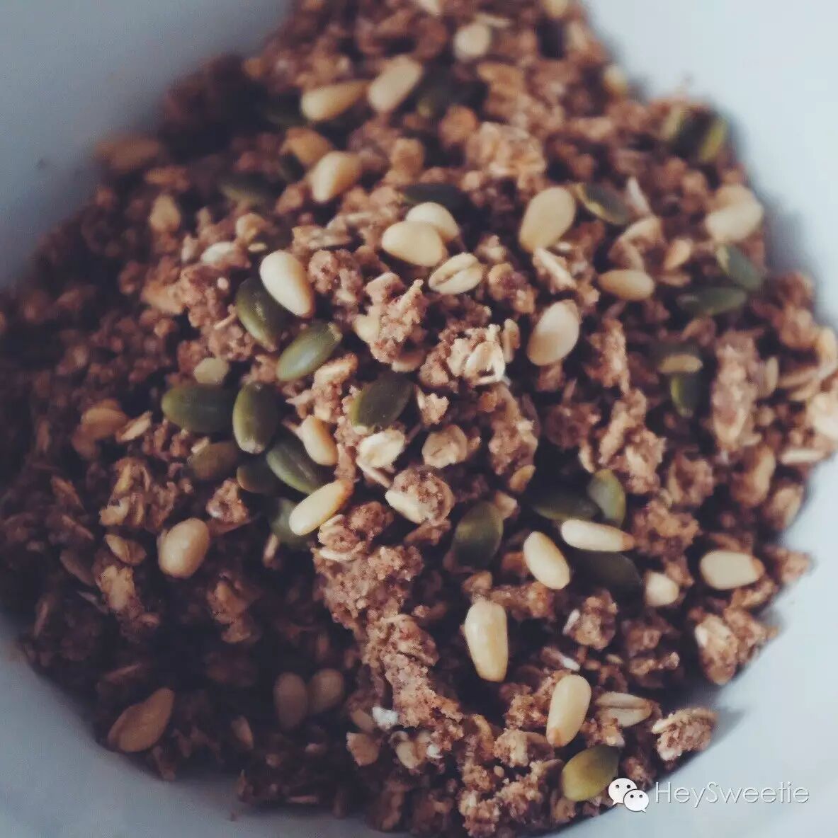 混合好之后加入南瓜籽、松子,如果有葵花籽的话也可以加一点。平整得铺在水果馅上。放入预热180℃的烤箱,烤30-40分钟,表面变得酥脆金黄即可。