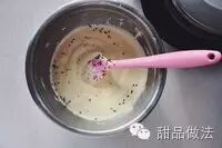 打发好的蛋清与蛋黄糊分三次混合,用橡皮刮刀上下翻拌均匀。
