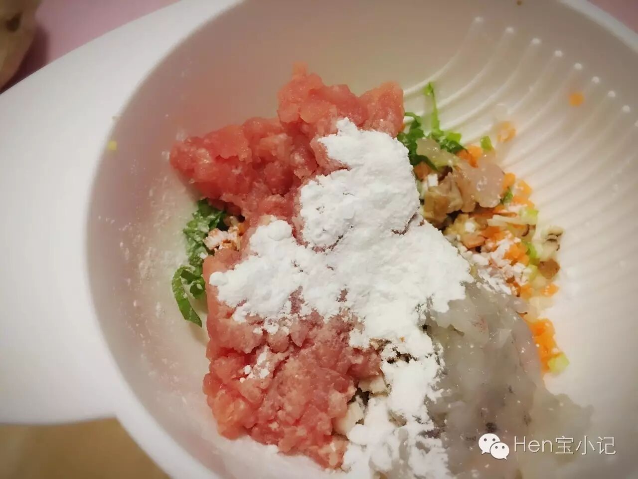 食材放在碗中,加入少量淀粉。(我还加了一点点调味的婴儿酱油和芝麻油,调料最好海淘)