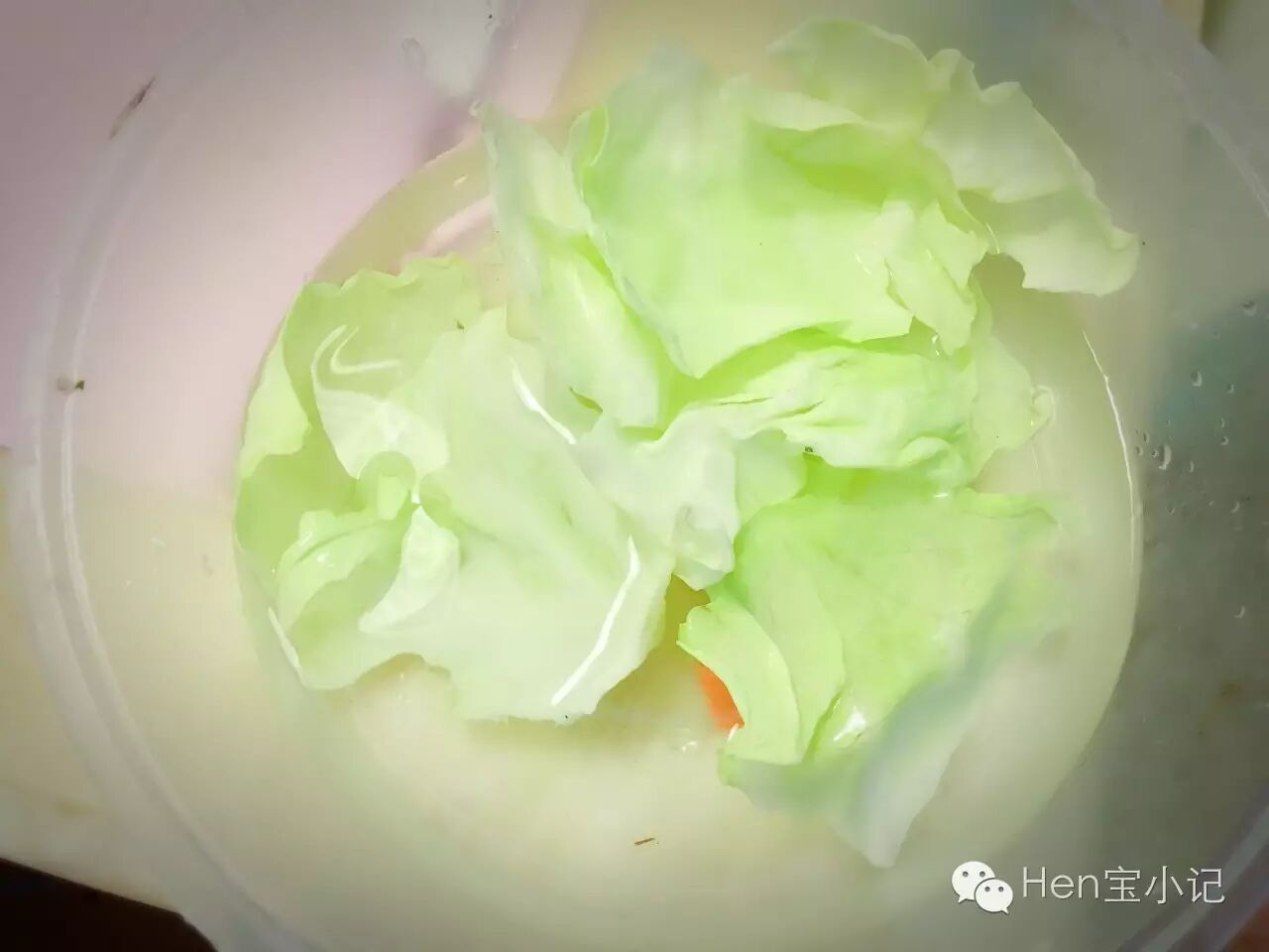 取卷心菜的几片菜叶,洗净备用(小朋友的食材一定要清洗干净,可以再拿盐水泡泡)