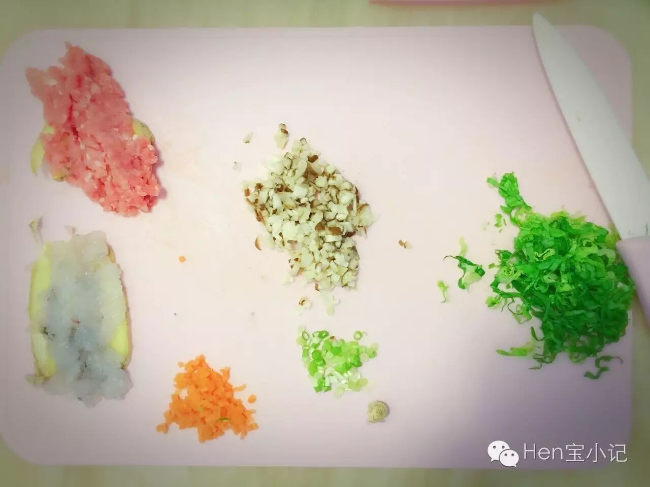 所有食材都剁碎,具体多碎看宝宝的接受程度。肉和虾用姜片腌起来(我的姜汁用完了,还没有榨。。。)