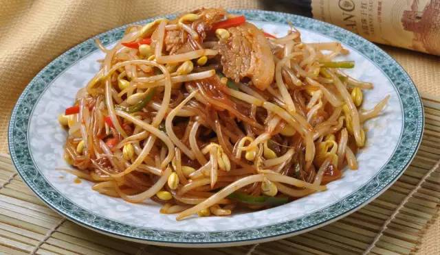 食材:豆芽,粉条,肉丝,葱,姜,盐,酱油