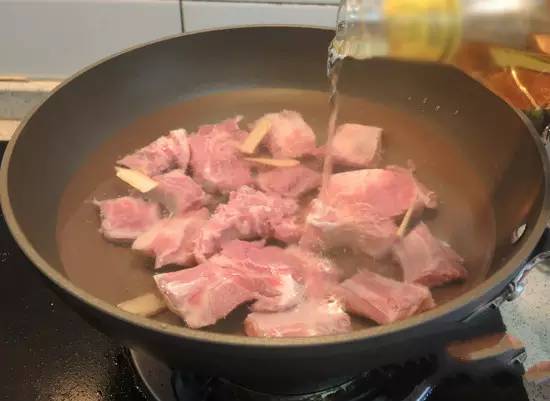 2. 排骨冲洗几遍后,浸泡20分钟,把血水泡出。排骨凉水下锅,倒入少许料酒,姜沫焯水除腥。水开后撇一撇血沫,尽量撇干净。