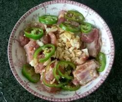2. 用一汤匙料酒,一汤匙生抽,半汤匙老抽,二汤匙香醋(不是白醋)腌渍20分钟。