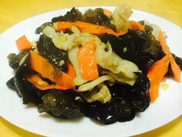 食材:胡萝卜,木耳,猪里脊,生粉,料酒,盐,耗油,糖,生抽