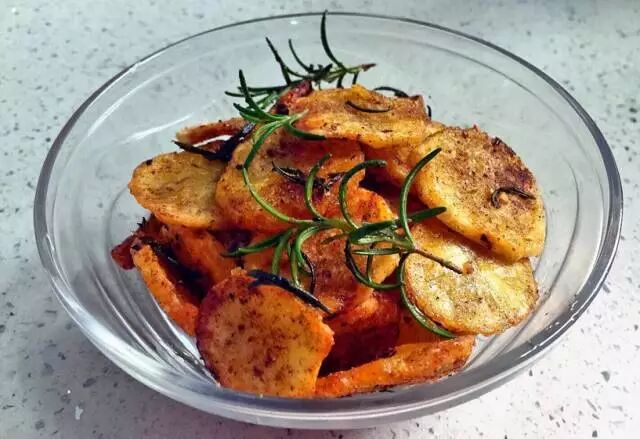 2.洗净的土豆片用厨房纸擦干,刷一层油,撒上盐、孜然粉和辣椒粉,拌匀