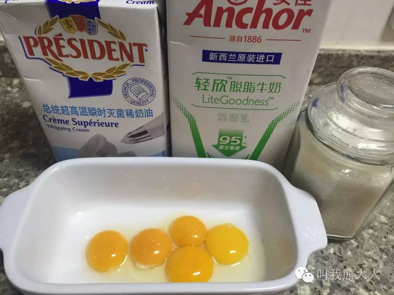 常常做菜,很多食材一次性又用不完,比如奶油吧。上期熊大人做了一道奶油烩鸡,味道不用说了。反正你们也吃不到。奶油开封后3天内需要使用完。所以熊大人今天教大家一道可以用掉奶油的甜点--焦糖布丁。