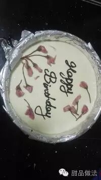 我是把巧克力放在裱花袋里隔水加热至融化,在油纸上写的生日快乐。。(不要看我那个HAPPY BIRTHDAY写那么丑T T其实我练了好久呢。。掩面555.。要是对自己的裱花字很自信的话直接在蛋糕上写那更好啦)