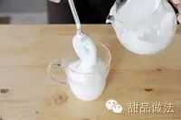 用一把勺子挡在奶罐口,使蒸汽奶泡流进杯中,量为不到杯子的1/3。