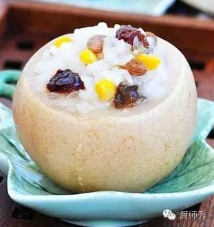果香糯米梨:将蒸熟的糯米饭拌入蜜枣、葡萄干、玉米粒等,放入中心挖空的雪梨中,压紧实,盖上切下的“梨盖”,上锅蒸5~8分钟即可。