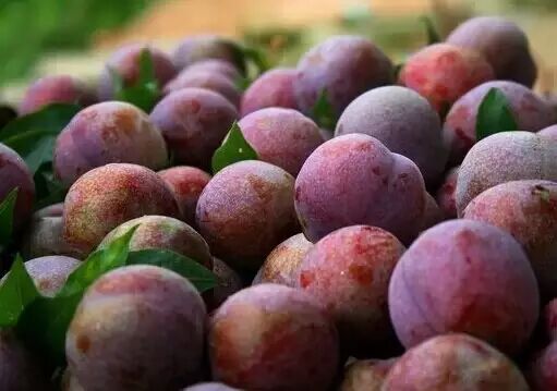 从化三华李,夏至时节果熟上市。果身披白粉,并有星星绿点。果肉呈紫红色,玲珑剔透。肉质爽脆、味甜多汁、微酸无涩味、肉厚核小,风味品质极佳。