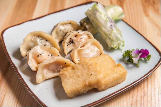 接下来就是重头戏综合锅贴了。一道对单身狗满满恶意的菜品,无论是肉锅贴,明虾锅贴,素锅贴,还是旁边的配角粢饭糕和蔬菜卷,都是双人份的!当然大胃王不包括在内:)一别过往锅贴配牛肉汤的油腻,蔬菜卷的新搭配让传统点心更符合现代人的口味。