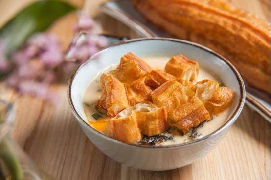 店里每一道点心颜值都颇高,首推的颜值王就是这碗咸豆浆了。作为一个甜党的忠实蹙拥者,一端上来第一眼就忍不住食指大动。葱花翠绿,饱满酥脆的油条半浸在浓稠的奶白色豆浆里,还有虾米,紫菜在底下暗香浮动......