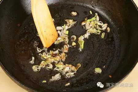 3、锅中留少许底油,放入葱花、蒜粒爆香。