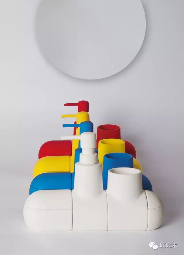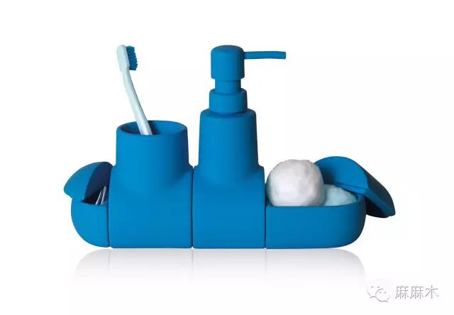 潜水艇由意大利著名家居品牌 Seletti设计,分为4个部分,包括一个牙刷架、皂液瓶、用于放棉签的大盒子以及放发带的小盒子。潜水艇内部的磁铁保证潜水艇的各部分能轻易的分开或连在一起,方便清洗和移动。