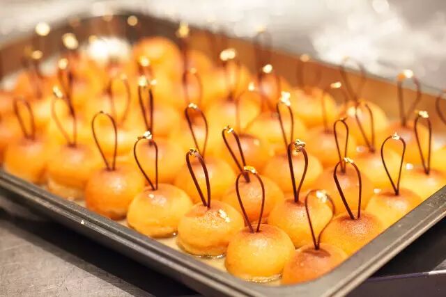接下来这个用了rumbaba(朗姆酒巴巴,图里类似“鱼蛋”形状,下文有rumbaba配方),搭配朗姆酒冰淇淋。