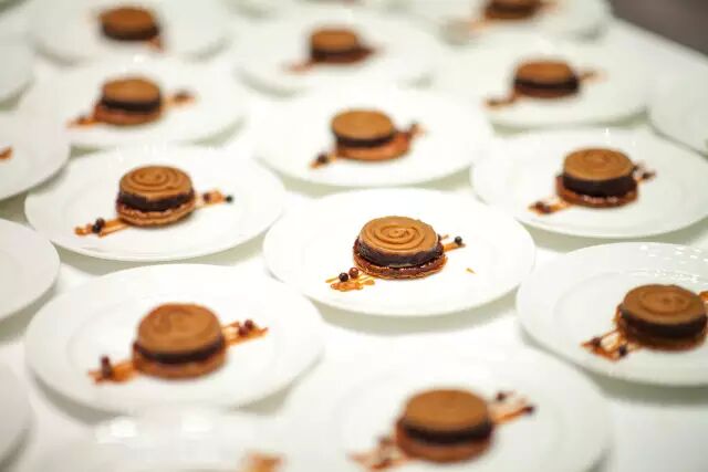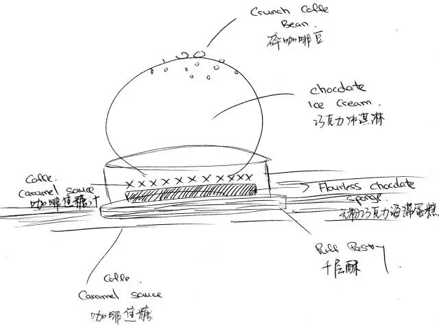 所以在做这款甜品的过程中动作要快。雪糕要冷冻,酥饼要放在温热的柜子里。酥饼一出,就要把蛋糕和咖啡焦糖放上,最后在放上巧克力雪糕棒。要不断地快速生产,让客人能吃到最好的口感。