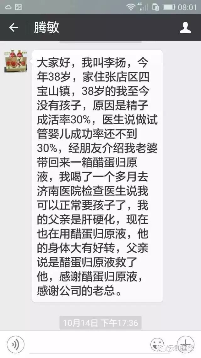 张店区医院一大夫38岁,4,5年不怀孕,婆婆着急给小两口1万元查体,医生让准备10万元做试管婴儿,经朋友喝醋蛋归元液(男女各一箱),去医院查体,从***成活率百分之30提高到百分之70,医生说不用做试管婴儿了,自然怀孕就行了,高兴的小两口回家就请客了,说醋蛋液给她们省下10万元,并且说如果怀孕了就辞去医院工作去推广醋蛋液,因为这这几年为了怀孕花费了很多还不如小醋蛋液。