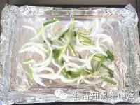 7.烤盘中铺上锡纸,刷薄薄的一层油,然后撒上一半的洋葱丝和少许芹菜段。
