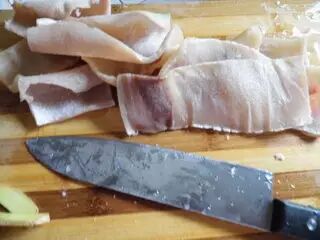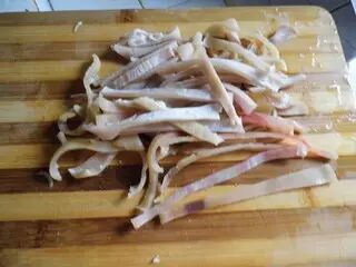 把刮干净的肉皮切成细丝