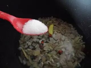 切好的肉皮丁放入高压锅里加2倍水,在放入姜片,八角,一勺盐设置炖肉键