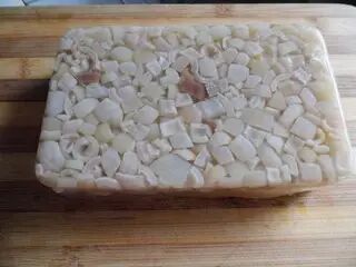 1,皮冻要想透明成水晶状,就要做到把猪皮上的肥油刮净,否则做出的皮冻味腥,不剔透