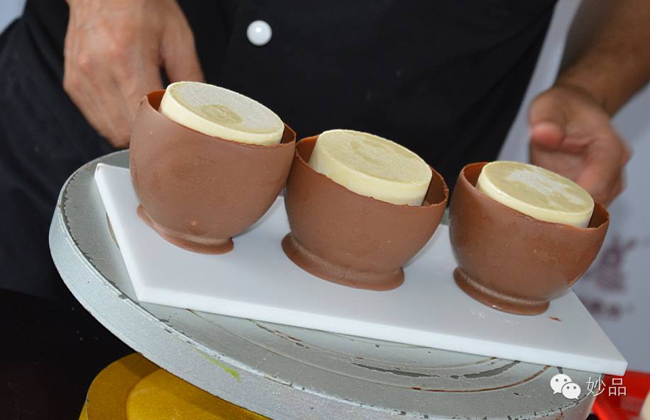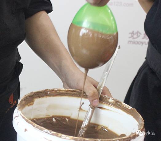 1.将博金黑、白巧克力在40°左右融化,并加入甘那许巧克力酱搅拌均匀。