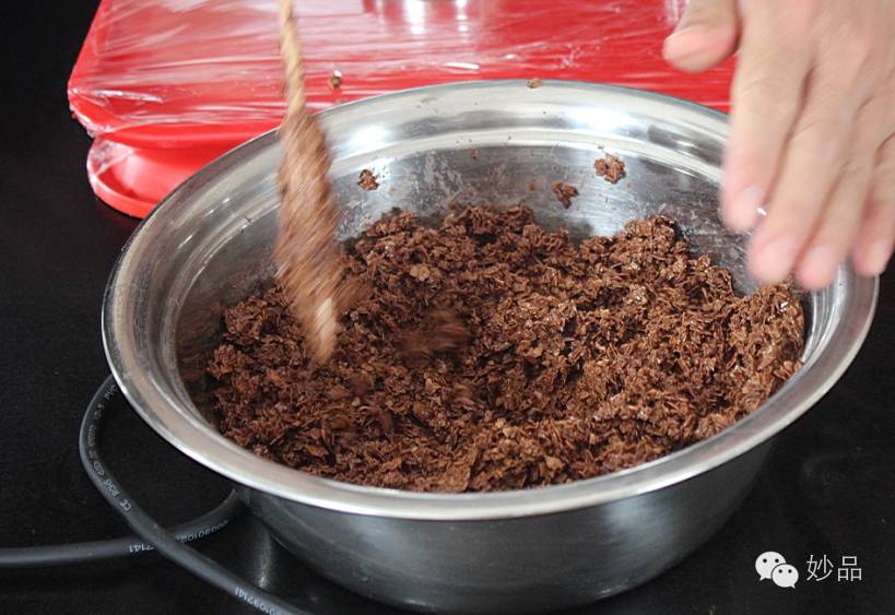 2.将原味麦片、部分拌匀后加入巧克力拌均匀即可 3.铺在模具压平,冷却即可