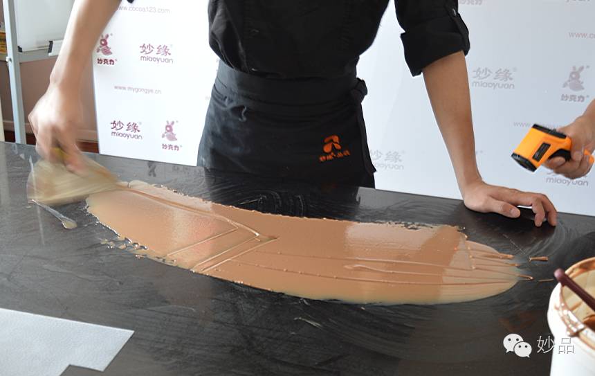 C:当冷却至48度时冲入巧克力内,加溶化的吉利丁
