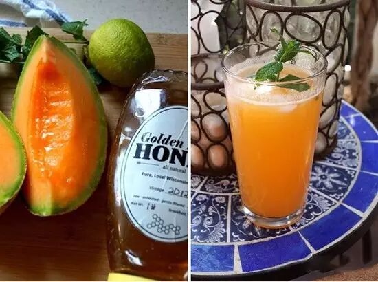 🌟哈密瓜汁+蜂蜜+青柠檬汁+薄荷叶+冰水