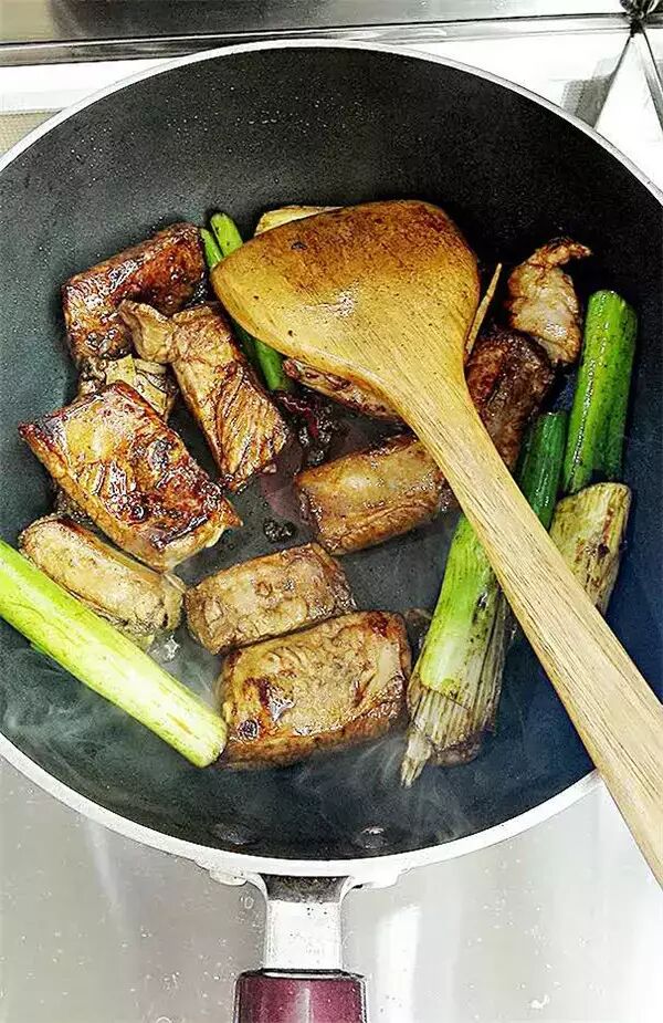 然后的把泡过的话梅和水一起倒在炒了糖色的排骨里,添入没过排骨的水,大火烧开,小火收汁。