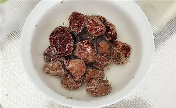 倒入用三五块冰糖、老抽、生抽混合的红烧汁再把排骨炒上糖色。这时这道菜味道的关键角色就出场了。把超市里买的话梅,千万记住不是话梅糖,而是那种果脯的话梅一包,用清水先泡上十几分钟。
