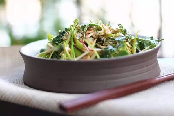 3、1.5勺生抽、1勺醋、小半勺糖和蒜蓉充分拌匀成湿料,将2料捞出,轻轻挤干水分放入拌匀,上桌前滴几滴麻油即可.