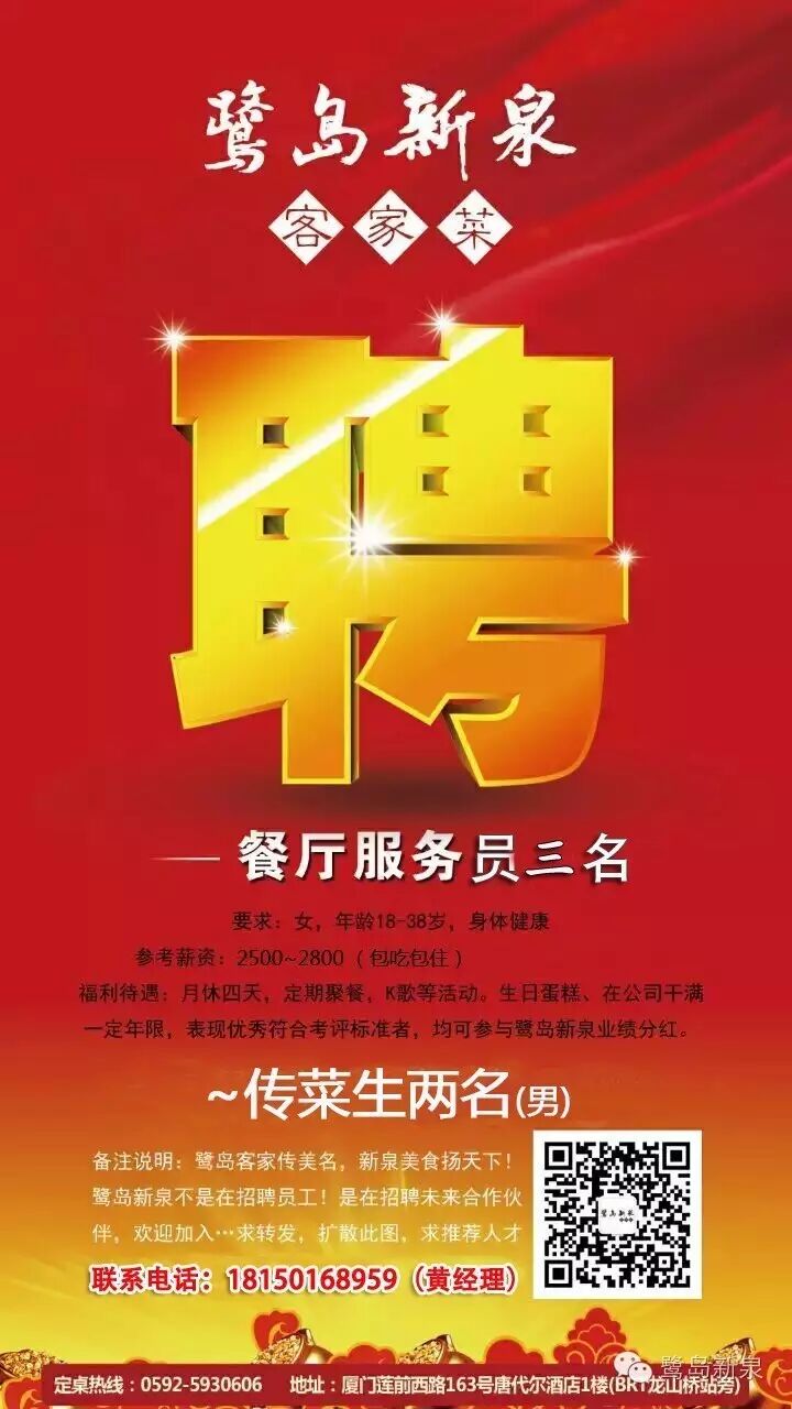 鹭岛新泉现诚聘聘餐厅服务员三名、传菜生两名,有意者可致电:18150168959 (黄经理)面试地址:厦门思明区莲前西路163号唐代尔酒店一楼(龙山桥BRT站旁)。求推荐人才,谢谢~