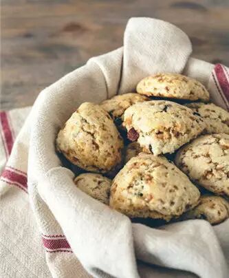 英国下午茶的经典茶点,类似曲奇,由小麦、大麦或麦片烘烤而成,通常还加葡萄干、干酪或枣等种类。南北部发音略有不同,为此还产生过激烈争论。目前各自都坚持自己的发音,有机会去南北部的朋友可以去听听差别。