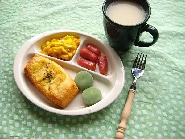 菠萝面包和两个绿茶小福+鸡蛋玉米粒+黄油煎香肠+一杯牛奶味阿华田
