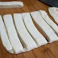 每个条从中间切一刀变成两个条,两条摞在一起,用筷子按压一条痕,不要太用力。