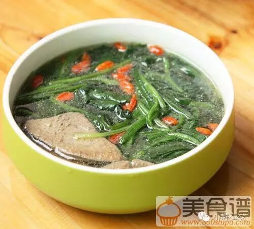 【原料】猪肝150克、菠菜250克、枸杞适量