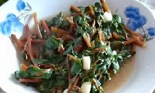 做法:将晒干的马齿苋用水泡发。锅内放少许油,加入猪肉,煸炒出油香,加姜蒜老抽等调料。加适量清水将肉焖烧至六成熟,再加入适量盐和尖椒调味。将汤汁收干,即可出锅。