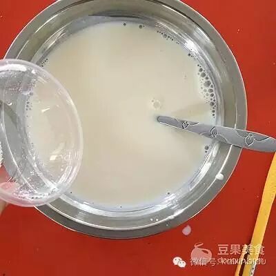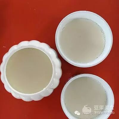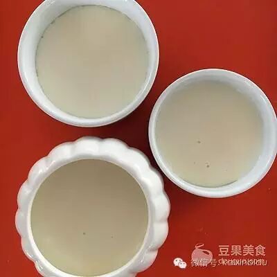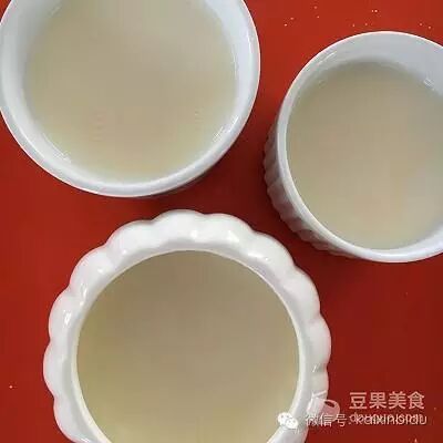 5、回倒要耐心。把蛋清奶液缓缓沿着刚才划破的奶皮缺口倒会碗里,让奶皮浮在上面。