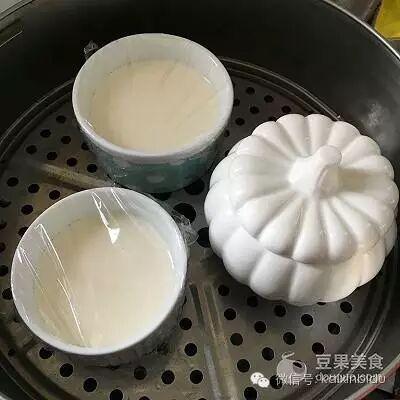 4、蒸好了,取出放凉。一定要放凉才会结出奶皮。