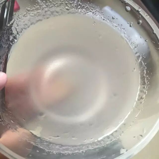 然后将上面的混合液体倒入锅中,边倒烧开的水边搅拌,搅拌好之后液体是完全水状的,不用担心。